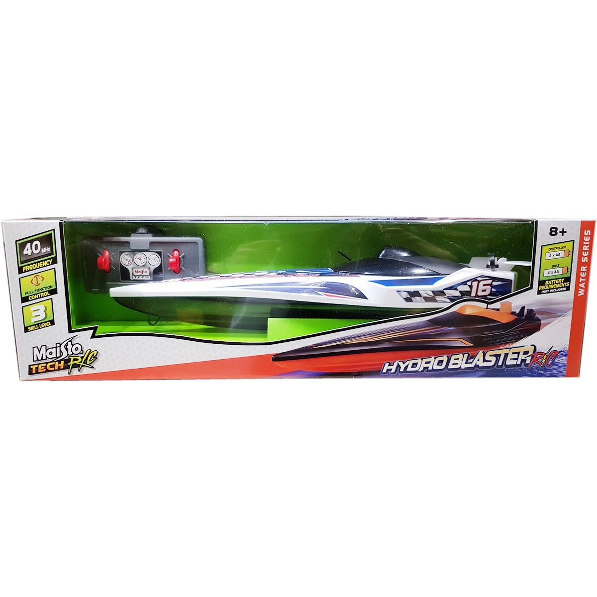 Barca cu telecomanda Maisto Tech Hydroblaster Speed special facuta pentru bazine si lacuri mai mici. Este ideala pentru initierea in cursele cu barci. Caracteristici: – 7 functii de comanda- aria de acoperire de 18 m- frecventa de functionare 27 MHz- telecomanda functioneaza cu 2 baterii de tip AA- barca functioneaza cu 4 baterii de tip AA Dimensiuni lungime: 30 cm Varsta recomandata: 8 ani + Atentie! Contraindicat copiilor mai mici de 3 ani. Jucaria poate contine piese mici, care se pot inghiti sau inhala, existand pericolul de sufocare. Nu lasati ambalajele jucariilor la indemana copiilor.