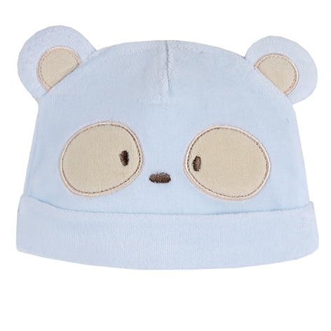 Caciulita din velur cu urechi si aplicatii ursulet. Exteriorul este confectinat din 80% bumbac bio, 20% poliester iar dublura din 100% bumbac bio.