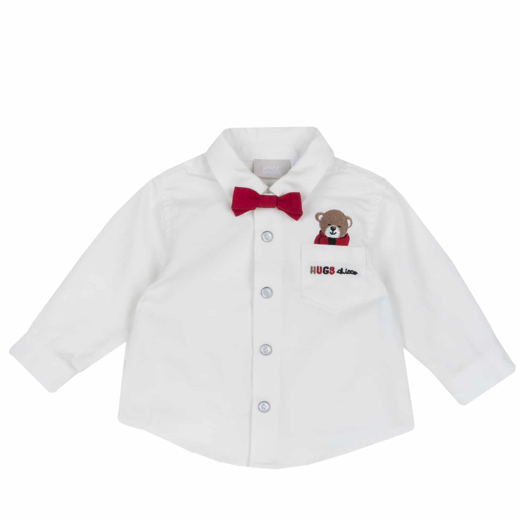 Camasa cu maneci lungi, guleras, buzunar din care iese un ursulet simpatic si papilon rosu, realizata din 100% bumbac.
