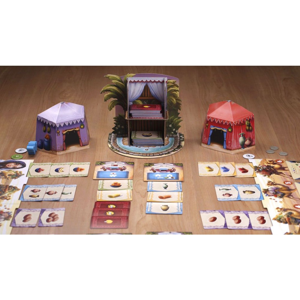 Componente: – 1 tablă de joc – 5 cămile de lemn – 1 piramidă – 40 de cărţi de pariu – 8 cartonaşe de deşert – 15 cartonaşe de pariuri – 5 cartonaşe de piramide – 20 cărţi ce reprezintă bani – 50 monede – 1 marker de prim player – 1 manual cu reguli