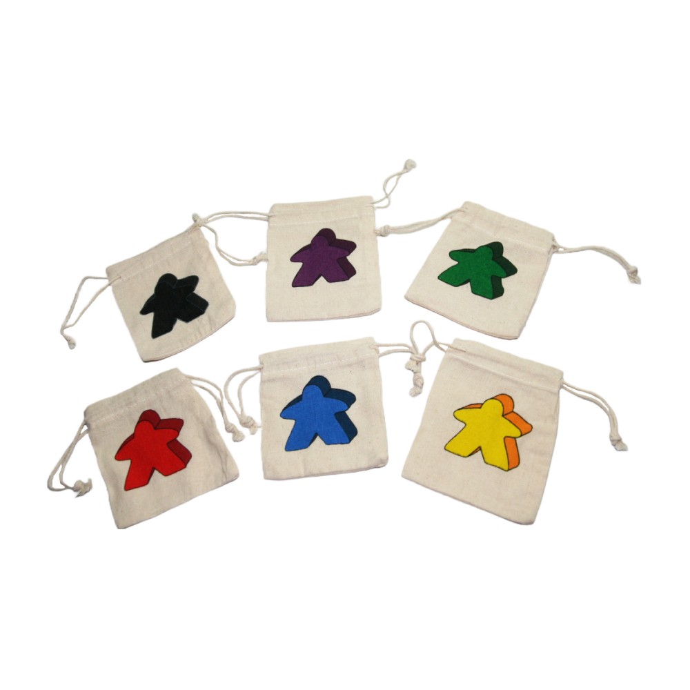 Set de 6 saculeti din panza pentru meeples, in culori diferite: albastru, rosu, verde, galben, violet si negru. Saculeti perfecti pentru depozitarea placutelor de joc Carcassone sau a altor accesorii. Dimensiuni saculet: 9,5 x 8,5 cm. Material: panza.