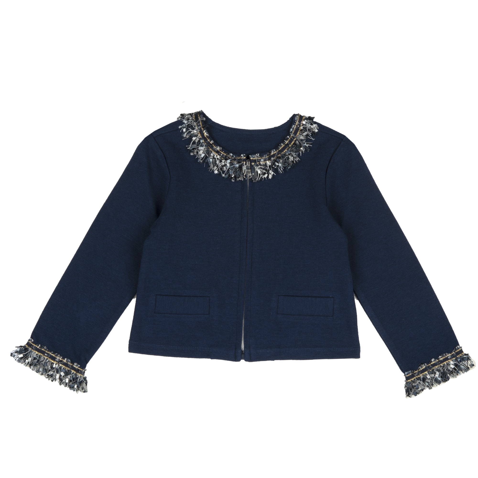 Jacheta cu decoratiuni fantezie si inchidere in fata. Eleganta si confortabila, este realizta din 61% bumbac, 37% vascoza si 2% elastan.