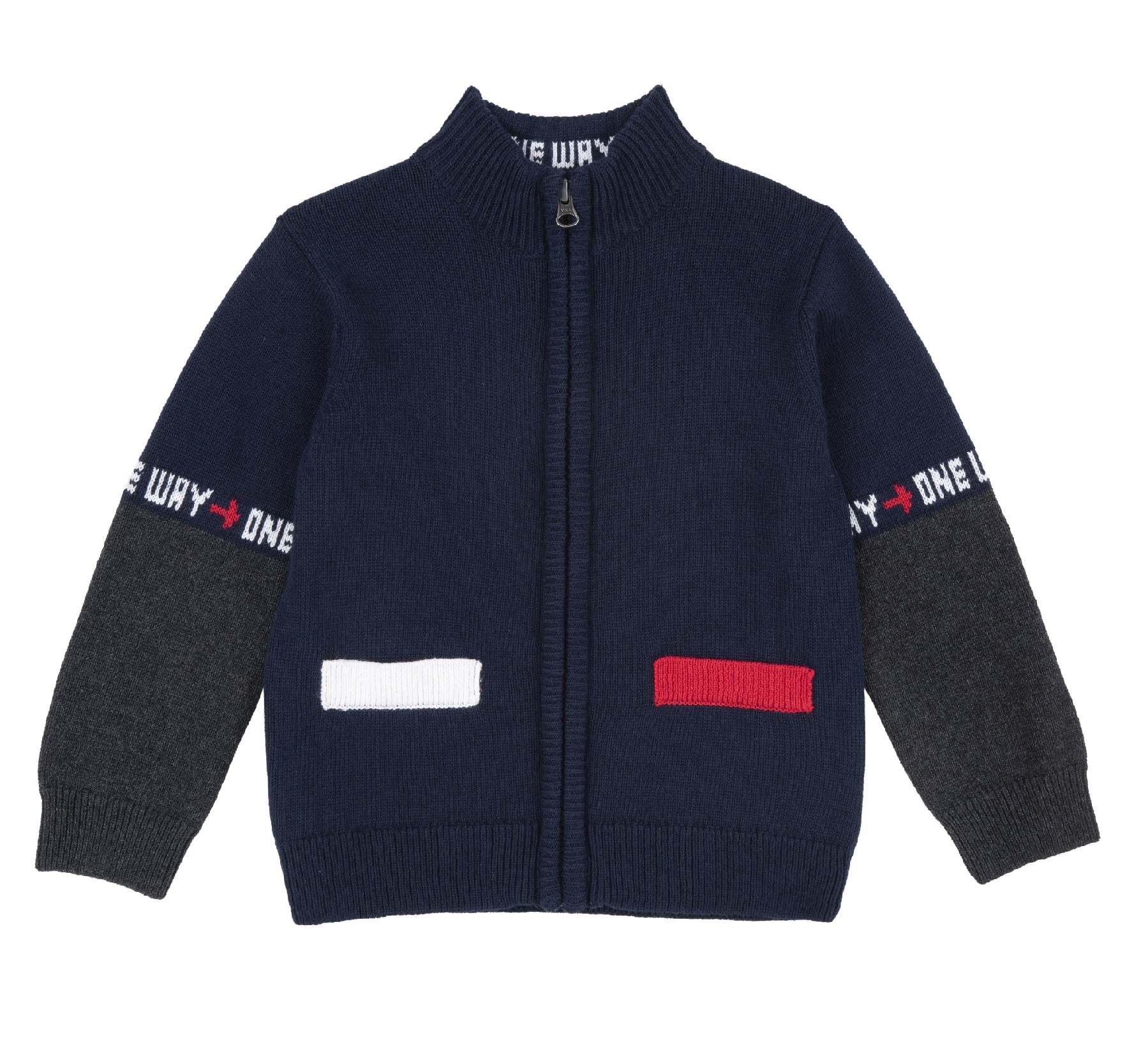 Cardigan tricotat cu logo pe maneci si pe guler, cu inchidere in fata – fermoar, mansete elastice si buzunare false colorate, realizat din 60% bumbac 30% poliamida si 10% lana.