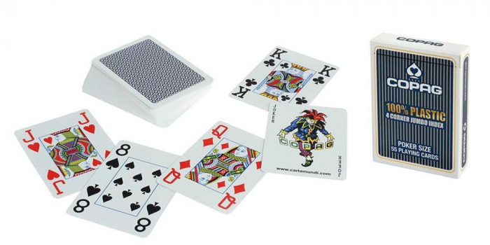 Carti de joc 100 % Plastic, model Jumbo Index de la firma Copag. Caracteristici: – 52 carti + 2 Jokeri -Dimensiune: 63 x 88 mm – Culoare Albastru
