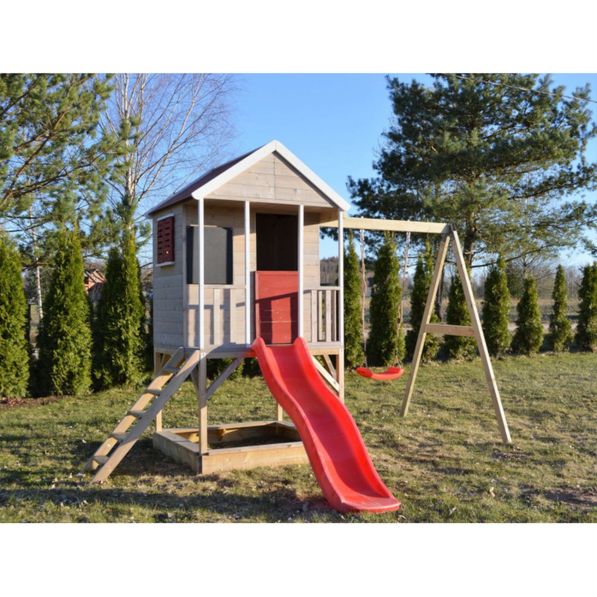 Casuta de gradina Summer Adventure House, din lemn, de la Wendi Toys este perfecta pentru o joaca creativa si distractiva in gradina ta! O frumoasa casuta de joaca, moderna si eleganta din lemn, perfecta pentru copii pentru a-si descoperi propria lume in propria casuta de gradina. Summer Adventure House ofera oportunitati perfecte de joaca afara chiar si in conditii meteo nefavorabile. Este excelenta pentru activitatile copiilor, si de ce nu, pentru mici petreceri aniversare in propria casuta de gradina. Casuta poate fi folosita si ca depozit de jucarii si accesorii. Cu un design deosebit, casuta ofera cadrul perfect pentru multe momente frumoase cu parintii si prietenii de joaca. Casuta este echipata cu: balcon, raft pentru jucarii, jumatate de usa, obloane, tabla neagra de scris cu creta, scara, tobogan, platforma, cutie de nisip, un leagan, 4 bucati de ancorare la sol, scaun din plastic. Casuta are si podea. Specificatii:- Culoare: Rosu / Alb / Natura- Dimensiuni casa: 120 x 120 x 155 cm- Dimensiuni externe totale ale produsului: 290 x 350 x 242 cm- Dimensiunile culoarului usii: 38 x 104 cm- Inaltimea platformei: 90 cm- Lungime tobogan: 175 cm- Inaltimea de leagan: 200 cm- Latimea leaganului: 150 cm- Suprafata interioara: 0.81 (m2)- Grosimea peretelui: 8 mm- Acoperis impermeabil- Grupa de varsta: 3-10 ani- Numarul de pachete: 6- Greutate totala: 101 kg- Greutatea maxima combinata a utilizatorilor: 100 kg Asamblare: Locul de joaca poate fi asamblat cu usurinta de catre cumparator, fara a fi nevoie de fixari suplimentare sau de instrumente speciale. Instructiunile de instalare si intretinere sunt detaliate pas cu pas si sunt usor de urmat. – Locul de joaca este fabricat din molid nordic si este protejat impotriva insectelor si atacurilor fungice. Pentru picturi se utilizeaza o vopsea certificata pe baza de apa.- Indeplineste standardul european EN-71 „Siguranta jucariilor” pentru echipamentele de joaca pentru uz casnic.- Toata cheresteaua folosita provine din padurile certificate FSC. Fiecare sistem este verificat si testat inainte de eliberarea din fabrica.- Casele de joaca sunt sigure si ecologice.- Intretinere: nu este necesara intretinere speciala. Ar putea fi tratat anual cu lac pentru lemn pentru a-l mentine mai sanatos. Produs fabricat in Letonia.