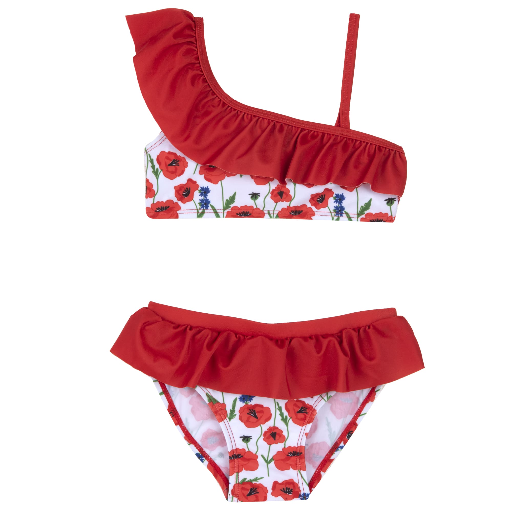 Costum de baie doua piese, cu un umar si volanase, confectionat din material indesirabil realizat din 83% poliester si 17% elastan iar dublura din 100% poliester.