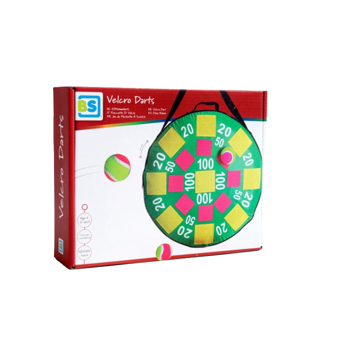 Un joc distractiv pentru intreaga familie, usor de luat in calatorii! Jocul include un panou mare, gonflabil, de darts usor de agatat oriunde. In locul sagetilor clasice veti arunca cu mingi, care se lipesc usor de panou, asa ca jocul poate fi jucat in siguranta chiar si de cei mici. Material: Poliester. Dimensiuni produs in ambalaj: 28 x 7 x 22 cm Dimensiuni produs: 35 x 35 cm Greutate produs: 675 g Varsta recomandata: 6 ani +