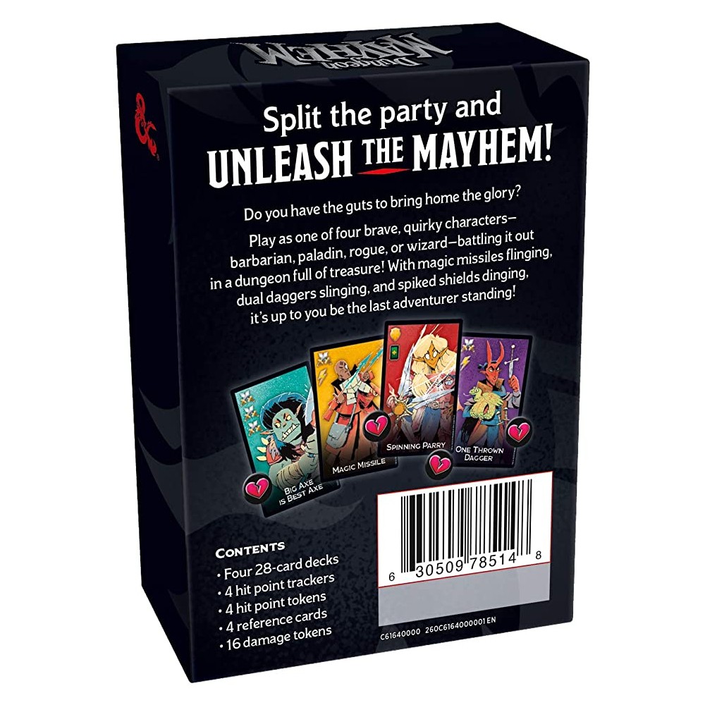 In jocul de carti Dungeons & Dragons, plin de actiune, Dungeon Mayhem, castigi daca vei fi ultimul aventurier ramas in picioare. Alege sa joci cu unul dintre cele patru personaje curajoase si inedite: barbar, paladin, rogue sau vrajitor, luptandu-l intr-