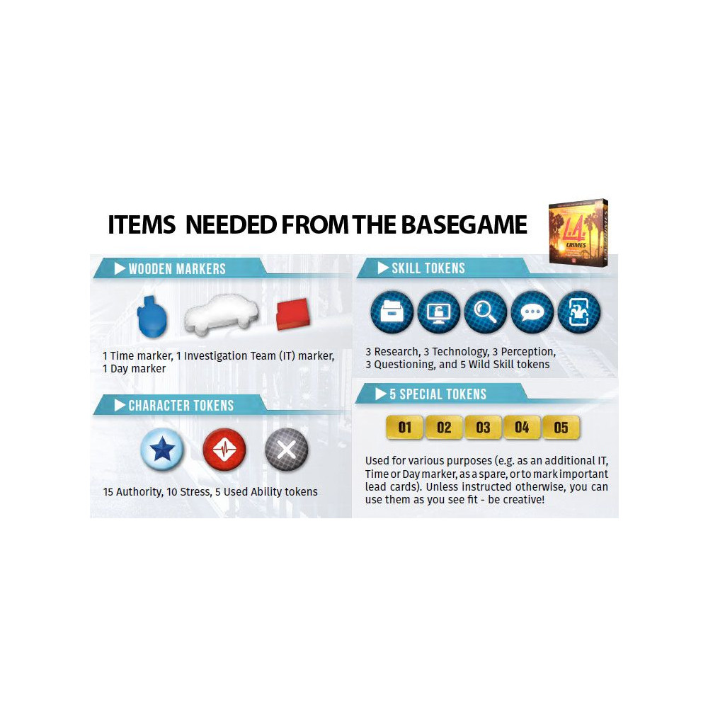 Detectiv: L.A. Crimes, prima expansiune a campaniei pentru jocul de baza Detective: A Modern Crime, consta in trei cazuri separate care se reunesc pentru a forma o poveste completa. Calatoreste in California insorita si aventureaza-te in Los Angeles-ul p