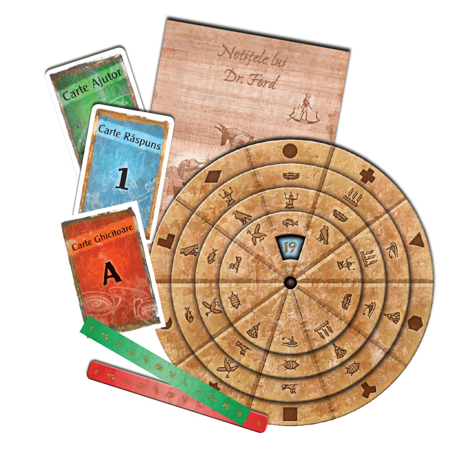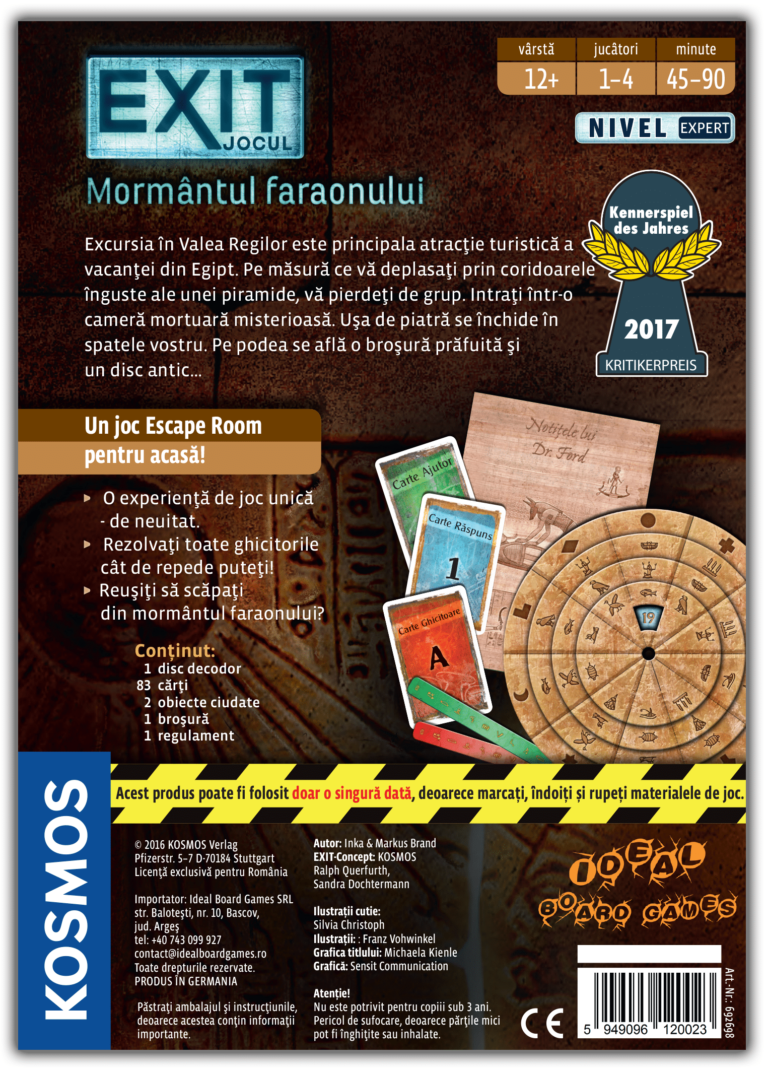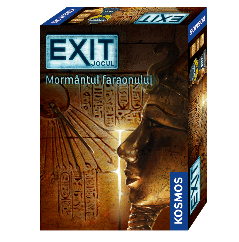 Excursia in Valea Regilor este principala atractie turistica a vacantei din Egipt. Pe masura ce va deplasati prin coridoarele inguste ale unei piramide, va pierdeti de grup. Intrati intr-o camera mortuara misterioasa. Usa de piatra se inchide in spatele vostru. Pe podea se afla o brosura prafuita si un disc antic…Puteti rezolva ghicitorile lasate de catre ultimul arheolog pentru a evada din piramida? Nivel de dificultate: 4 din 5. Acest produs poate fi jucat doar o singura data, deoarece marcati, indoiti si rupeti materialele de joc pentru a rezolva ghicitorile, si implicit sa evadati.ATENTIE!Din cauza unei erori de tipar (doar la EXIT – Mormantul faraonului), cartile „Ajutor” sunt imprimate pe verso doar cu „INDICIUL 1”, in loc de: „INDICIUL 1”, „INDICIUL 2” si „SOLUTIE”. In schimb, pe fata, cartile sunt tiparite corect, avand indicat si tipul de ajutor (Indiciul 1, Indiciul 2 si Solutie). Cartile ajutor sunt deja aranjate in ordine, in pachet. Trebuie doar sa nu le amestecati si sa respectati ordinea respectiva. Atunci cand aveti nevoie, cautati cartile Ajutor care au pe verso simbolul ghicitorii pe care incercati sa o rezolvati. Uitati-va la cartea Ajutor aflata deasupra, verificand pe fata titlul acesteia (numarul indiciului). Bineinteles mai intai veti citi cartea Ajutor „Indiciul 1”, apoi cartea „Indiciul 2” iar in cele din urma, cartea „Solutie” (doar daca nu ati rezolvat inca ghicitoarea respectiva).