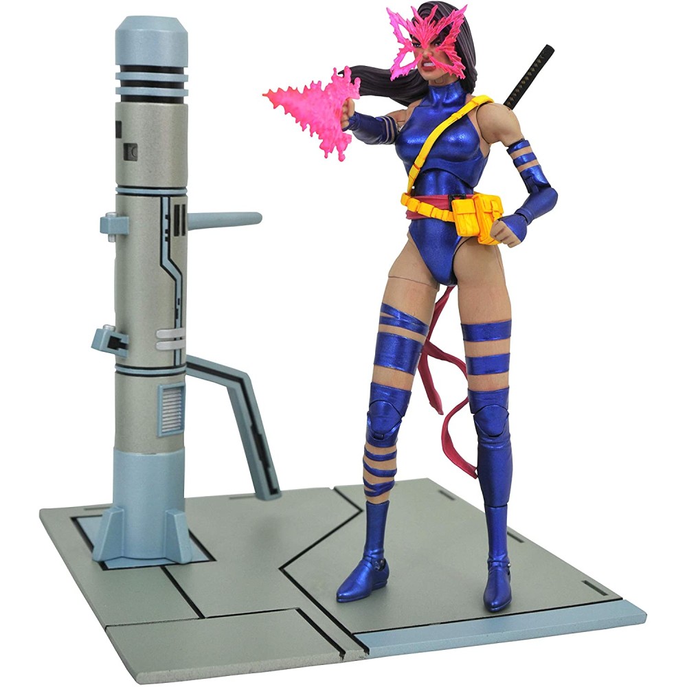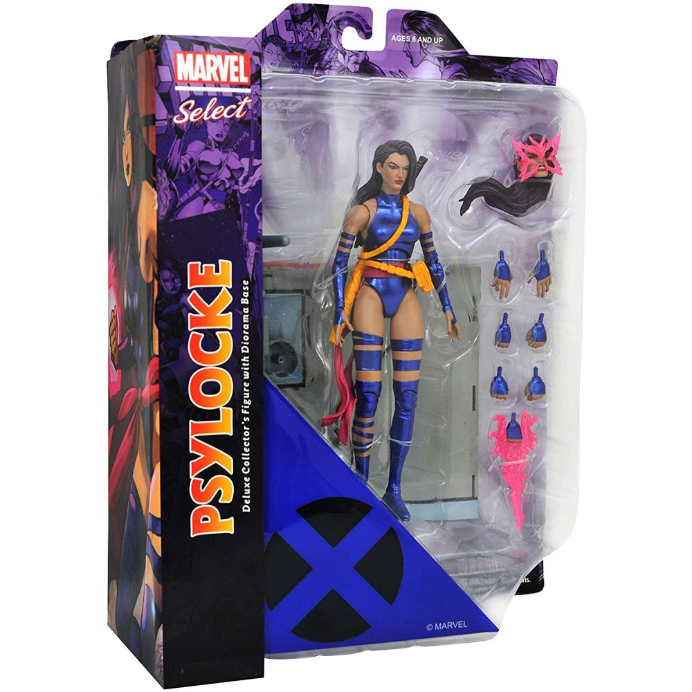 Aceasta figurina articulata cu Psylocke masoara 18 cm, are 16 puncte de articulatie, include multiple piese interschimbabile si o baza display Dangerous Room care poate fi combinata cu alte figurine Marvel Select X-Men pentru a construi o diorama mai mar