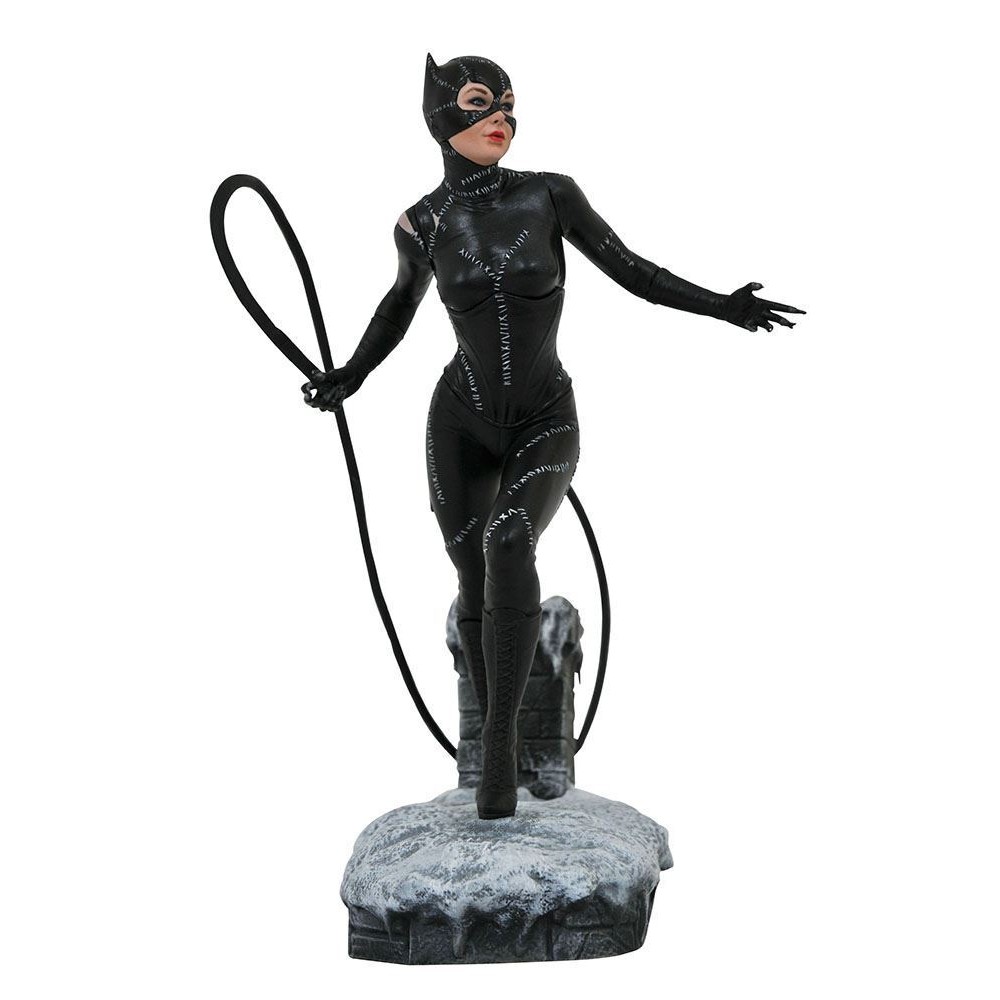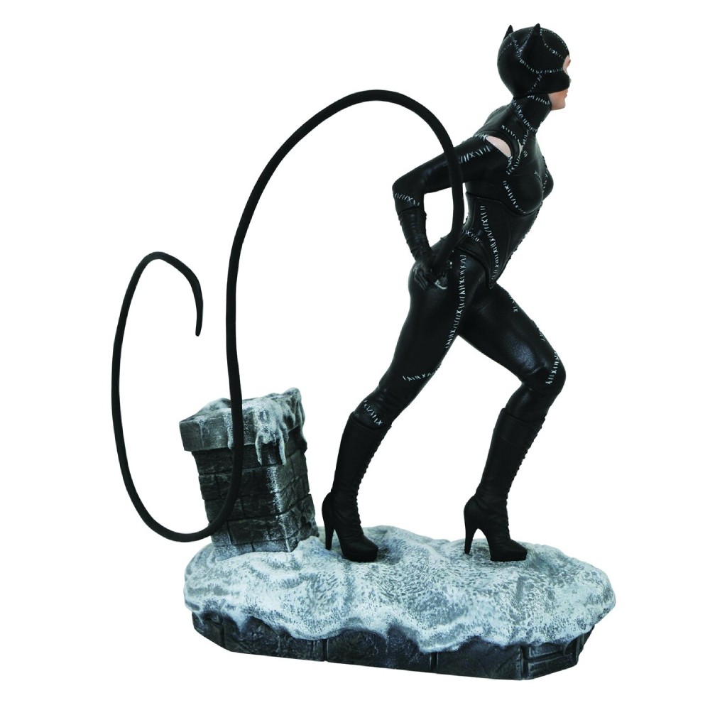 Aceasta statueta cu Catwoman este inspirata din filmul Batman Returns din 1992, din scena in care actrita Michelle Pfeiffer se ascunde pe un acoperis inghetat in tinuta ei iconica din vinil, tinand in mana un bici. Masoara 20 de cm.