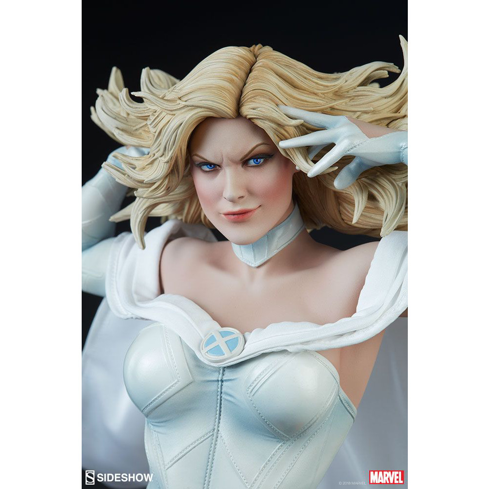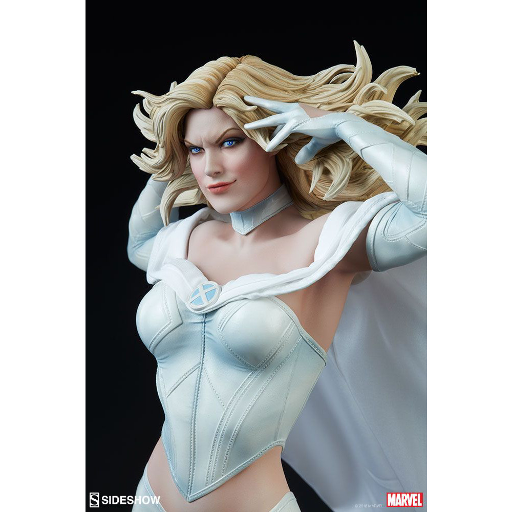 Aceasta statueta minunata Premium Format o infatiseaza pe Emma Frost intr-un costum superb cu o pelerina din tesatura alba, la care se adauga manusi si cizme, toate redate in detaliu, cu texturi variate, modelate subtil, care surprind eleganta si straluc