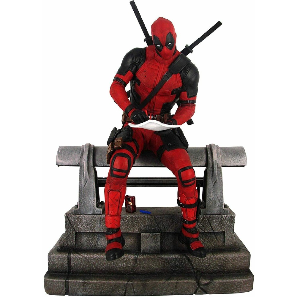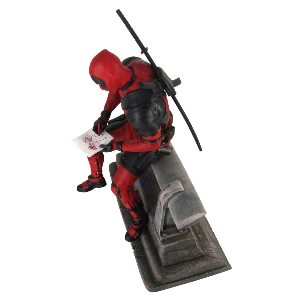 Deadpool isi face aparitia cu aceasta statueta Premier Collection, inspirata din primul film Deadpool! Asezat pe o bara de protectie, lucrand la un autoportret in timp ce asculta Salt’N’Pepa, Deadpool pare ca tocmai a iesit din ecran in aceasta statueta