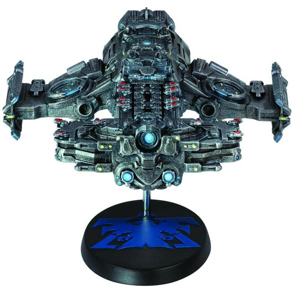 Replica extrem de detaliata de 15 cm a navei spatiale de razboi Terran Battlecruiser din franciza jocurilor StarCraft. Figura este sustinuta de un suport cu logo-ul blazonului Terran Dominion Marine Corps. Dimensiuni (L x l x i): 7.5 x 5 x 15 cm.