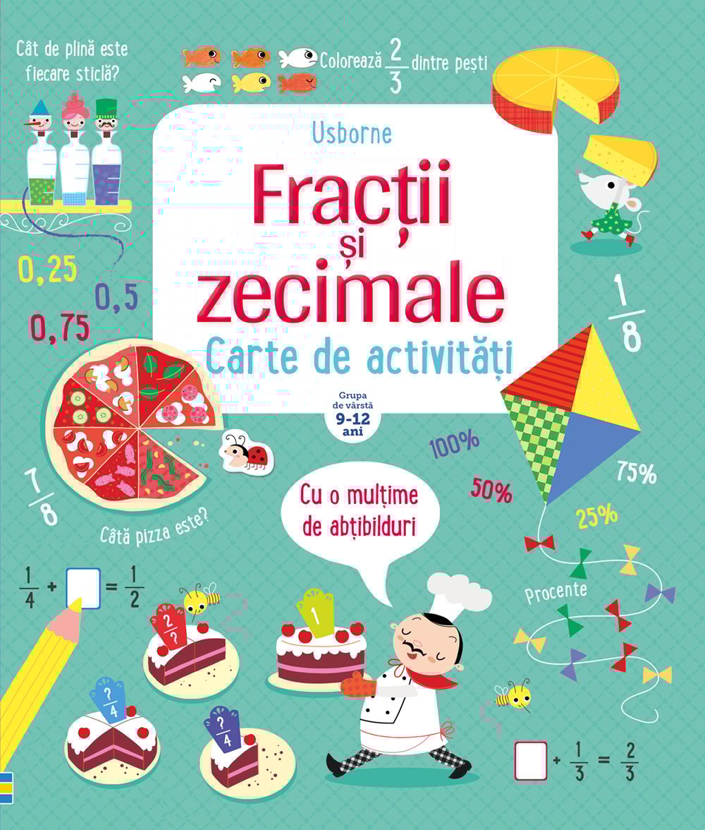Aceasta lucrare incitanta, plina de activitati practice si puzzle-uri, ii ajuta pe copii sa-si perfectioneze cunostintele despre fractii, zecimale si procente intr-un mod deosebit de placut. Excelent ilustrata, cu roboti care rezolva fractii, torturi de inghetata, labirinturi zecimale, patru pagini de abtibilduri si raspunsuri complete la sfarsit, cartea este destinata celor intre 9 si 12 ani. Cat de plina este fiecare sticla, Cum colorezi 2/3 dintre pesti, Cata pizza a ramas?… – suntdoar cateva dintre intrebarile la care copilul dumneavoastra va invata, intr-un mod distractiv si logic, sa raspunda. Numar pagini: 44Dimensiuni: 20 x 24 cmTip coperta: NecartonataAn aparitie: 2019Autor: Usborne