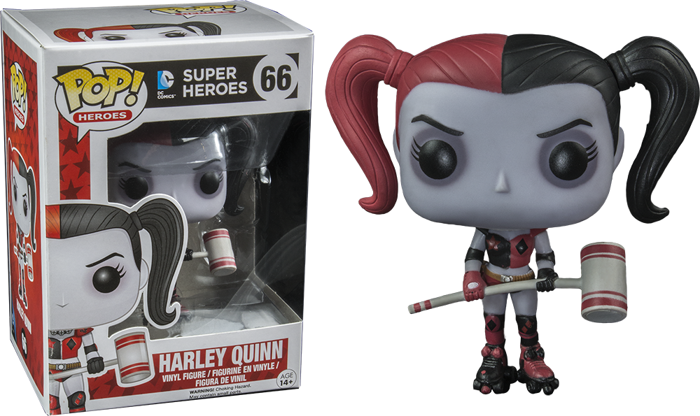 Din universul super-eroilor DC Comics, figurină Funko Pop! Vinyl Harley Quinn, în varianta costumaţiei Roller Derby.