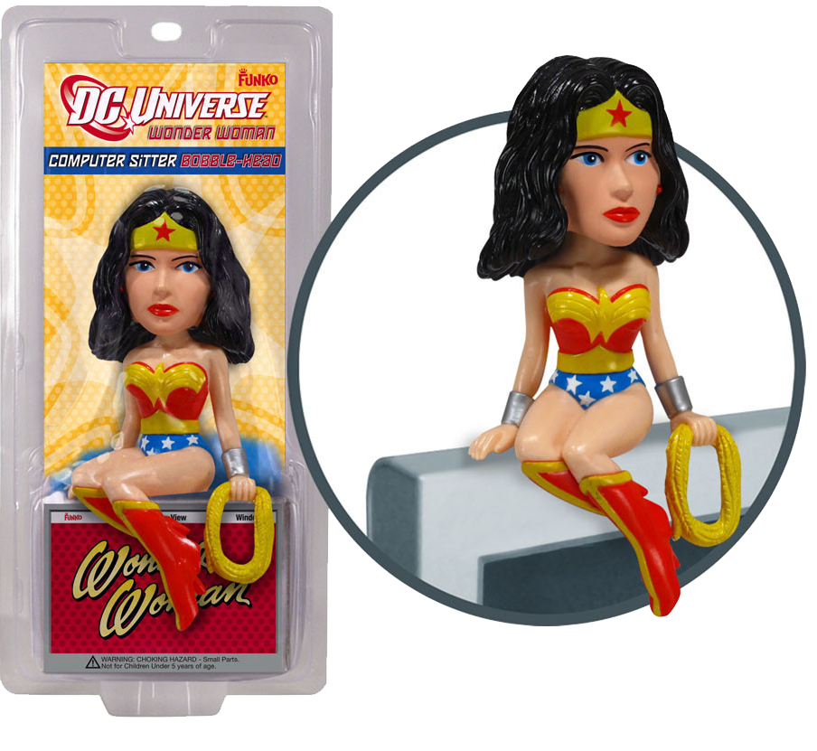 Din universul super-eroilor DC Comics, figurină Wonder Woman Funko Pop! Vinyl ce poate fi ataşată de ecranul unui monitor.