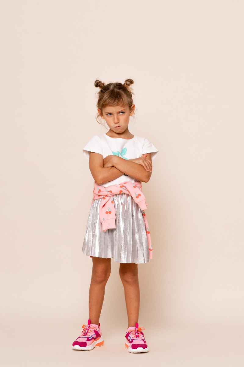 Fusta argintie plisata pentru fete, cu talie elastica contrastanta si dungi roz, albastre si negre. Este o piesa vestimentara moderna si la moda, perfecta pentru toate ocaziile. Compozitie material: 100% Poliester
