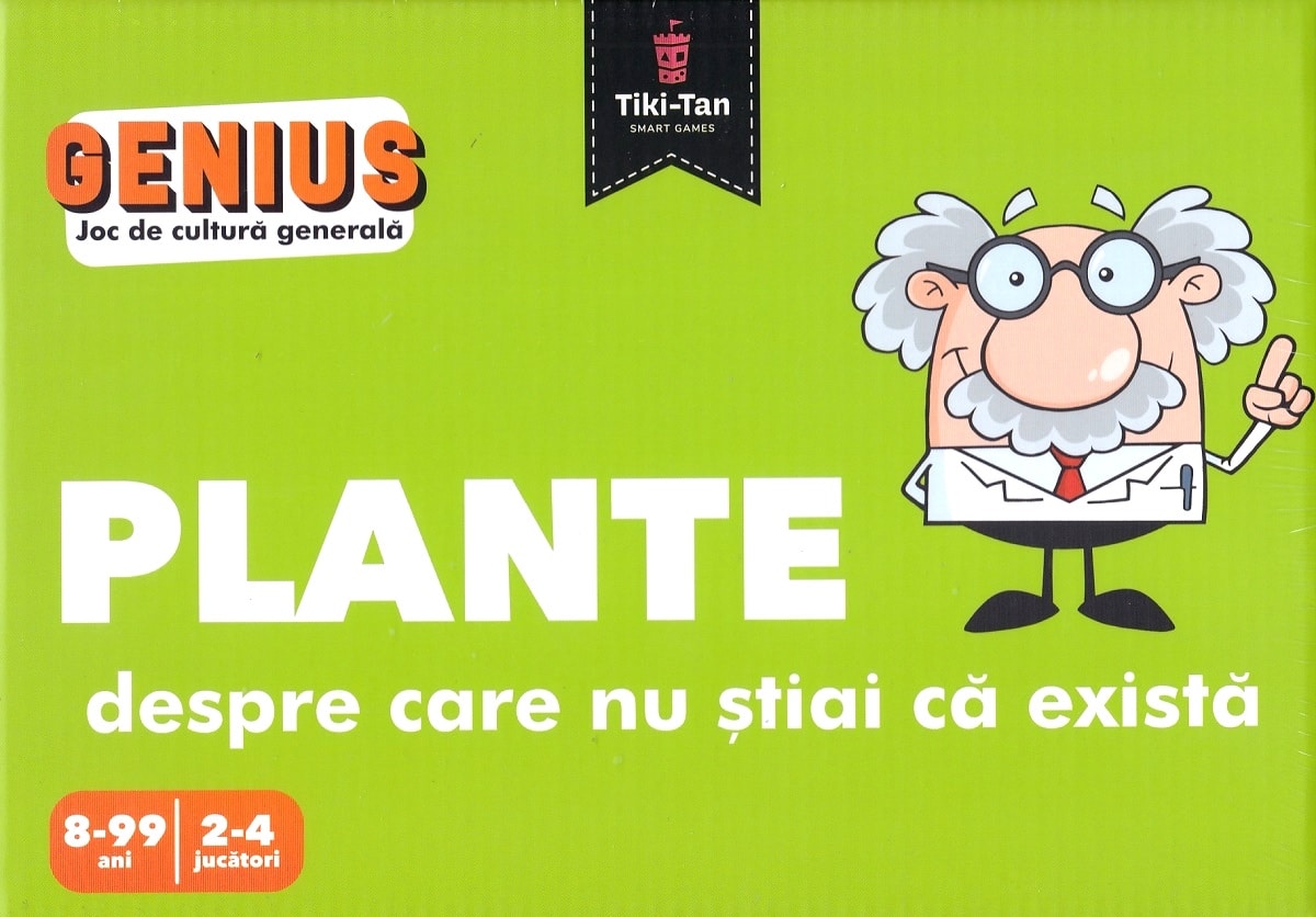 Enciclopediile nu trebuie sa fie neaparat niste tomuri plictisitoare!Stiai ca exista flori care miros a ciocolata cu lapte, ca exista nuferi cu frunze mai mari decat un prosop de plaja, ca plantele carnivore traiesc si in Romania, iar cei mai batrani si mai mari copaci din lume cresc in America?Imbogateste-ti cultura generala in cel mai antrenant chip cu putinta si provoaca-li prietenii la intrecere.Ai nevoie doar de sete de cunoastere si simt de aventura ca sa devii GENIUS!Printre plantele mai putin cunoscute regasim: Arborele de bumbac de matase / Capochierul • Arborele persan de matase • Lantana, floarea-cameleon • Plantele-ulcior • Floarea-pelican • ScanteioaraComponente:- 6 pliante cu intrebari si raspunsuri- o clepsidra- 6 pioni- un zar- o plansa de joc- cartonase cu pedepse si recompenseAVERTISMENT: Contraindicat copiilor mai mici de 3 ani. Pericol de sufocare datorita componentelor mici.