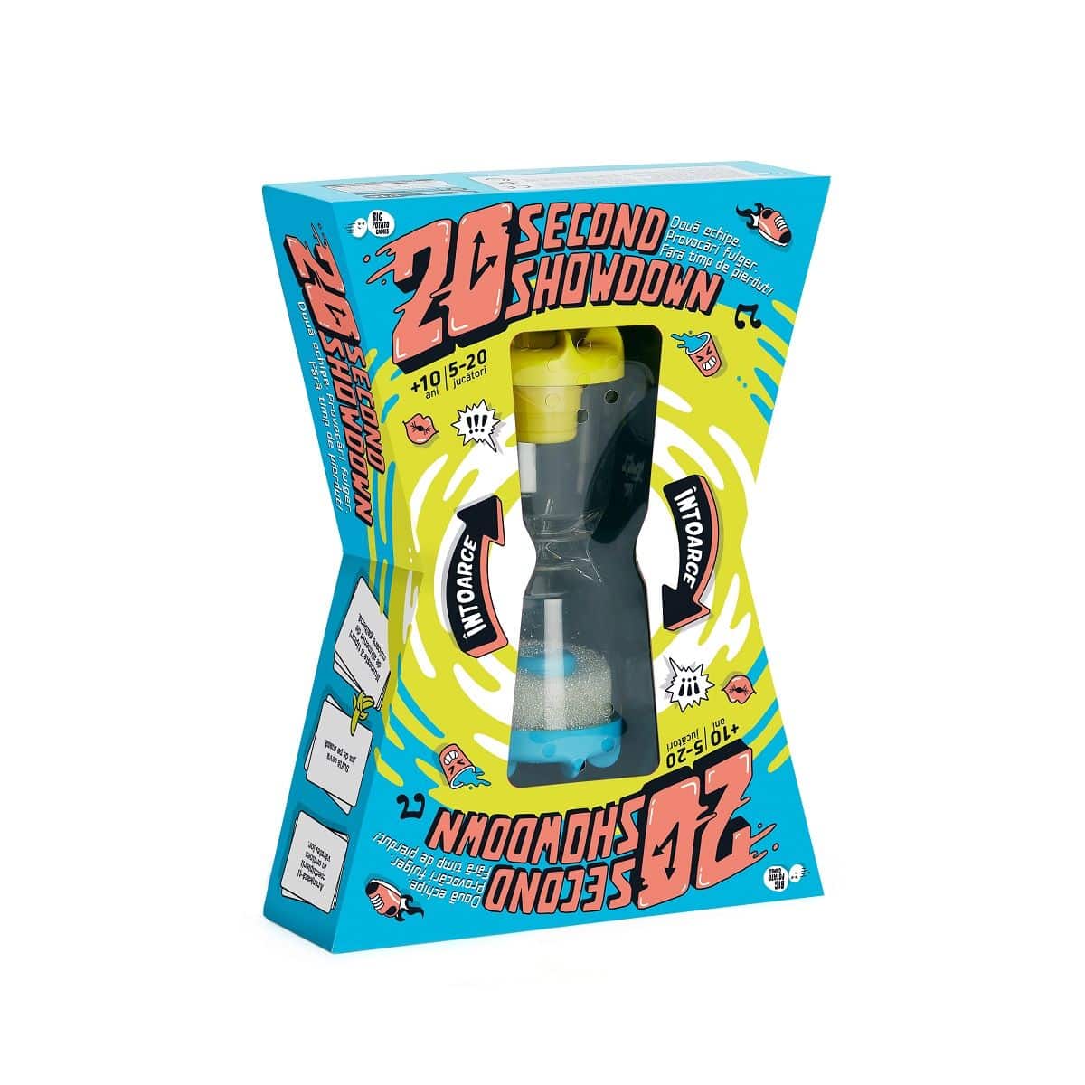 Descopera 20 Second Showdown, un joc de societate pe echipe care iti testeaza spiritul competitiv in indeplinirea unor provocari fulger!Jocul include 198 cartonase cu cate 2 Provocari, 2 cartonase Ajutor, 1 clepsidra cool, 2 stafete, instructiuni de joc in limba romana.Pentru a castiga, trebuie sa faci parte din echipa ce castiga prima 3 runde ale jocului. Castigarea unei runde consta in realizarea provocarilor, inainte de a se scurge nisipul din clepsidra.