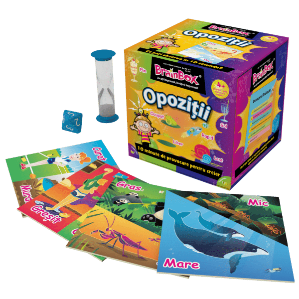 Copiii cu varsta peste 4 ani pot afla despre antonime, antiteze si lucruri opuse cu acest BrainBox frumos ilustrat. Conceput pentru parinti sa se joace cu copiii lor, acest joc minunat va imbunatati abilitatile de observare si memorie. Indiferent daca jucatorii sunt mai in varsta sau tineri, mari sau mici, BrainBox Opozitii va oferi distractie pentru toata familia. Daca esti cel mai tanar jucator tragi un cartonas din cutie si intorci clepsidra. Studiezi imaginea si informatiile de pe fata cartonasului pana cand se scurge nisipul din clepsidra (10 secunde). Clepsidra mai poate fi intoarsa inca o data pentru ca jucatorii mai tineri sa aiba mai mult timp pentru a studia cartonasul. Apoi dai cartonasul unui alt jucator si dai cu zarul. Vei raspunde la intrebarea cu numarul indicat de zar. (Ex. Daca dai cu zarul un doi, atunci vei raspunde la intrebarea cu numarul doi).Fabricat dintr-un minimum de 70% material reciclat, gama BrainBox este o distractie fabuloasa. Mod amuzant si usor de a invata despre opuse. Un mare joc de familie incrucisat. Imbunatateste abilitatile de lectura, observatie, memorie si reamintire.Rapid si usor de inteles si de invatat.Dezvoltat de un profesor de scoala primara experimentat.Potrivit pentru copii cu varsta peste 4 ani.Simplu de jucat de unul singur sau cu cat mai multi jucatori doriti.Proiectat in Marea Britanie.Poate fi jucat timp de 10 minute sau se poate juca pana la epuizarea cartonaselor. Cuprins: 55 de cartonase, 1 cartonas cu reguli, 1 clepsidra, 1 zar