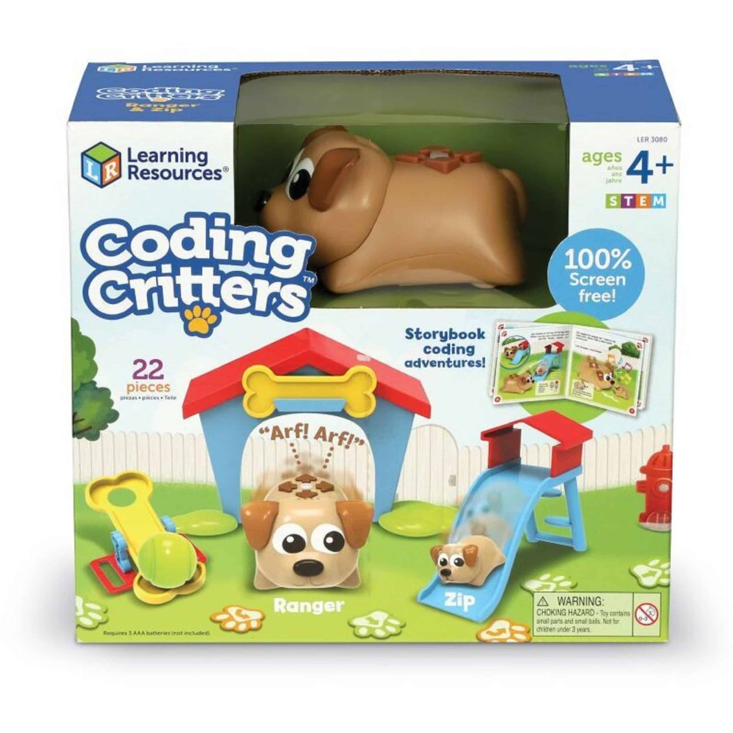 Adopta animalutele simpatice si distractia incepe! Un set conceput special pentru micutii care abia descopera notiunile de codare! Caracterisitici:simpaticele animalute ii vor invata pe copilasi concepte primare STEM prin jocuri interactive si multe provocariprimul joc in care notiunile primare de codare se intalnesc cu elementele paradigmei STEM (experimente cu elemente din viata de zi cu zi care sa ii ajute pe cei mici sa inteleaga cu usurinta diferite fenomene si concepte)nu necesita laptop/calculator, tableta sau telefon mobil pentru a fi folositusor de folosit ii familiarizeaza pe cei mici cu notiuni primare de codarecontribuie la dezvoltarea gandirii analitice si critice, la rezolvarea de probleme si la imbunatatirea vederii spatialefoloseste carticica inclusa pentru a-i face pe simpaticii catelusi Ranger si Zip sa aiba parte de distractie pe cinsteurmeaza instructiunile si descopera daca poti sa il programezi pe Ranger sa se joace de-a v-ati ascunselea, sa prinda mingea sau sa il prinda pe micutul Zip cand se da pe tobogancatelusii interactioneaza cand nasucurile lor se atingpe langa provocarile propuse, puteti folosi setul pentru a inventa propriile jocuri de codare si altelecatelusul Ranger necesita 3 baterii AAA (neincluse in pachet)Modul codare: Apasati butoanele care indica directia, aflate pe spatele catelusului, pentru a incepe introducerea unei secvente de codare formata din 30 de pasi. Un pas masoara aprox. 10.2 cm.Simpaticele animalute pot fi folosite si ca jucarii interactive: apasati pe nasul lui Ranger pentru a intra in modul joc („play mode”) unde il puteti hrani, mangaia sau va puteti juca cu simapticul catelus. Puteti chiar sa il faceti sa danseze sau sa cante un cantecel haios.Setul include:carticica in limba engleza 10 carduri sub forma de labute cu elemente de codare – directii pe care le va urma catelusul3 elemente decorative din cartonelemente pentru jocurile de codare: minge, balansoar-lansator de minge, casa si toboganinstructiuni in limba engleza