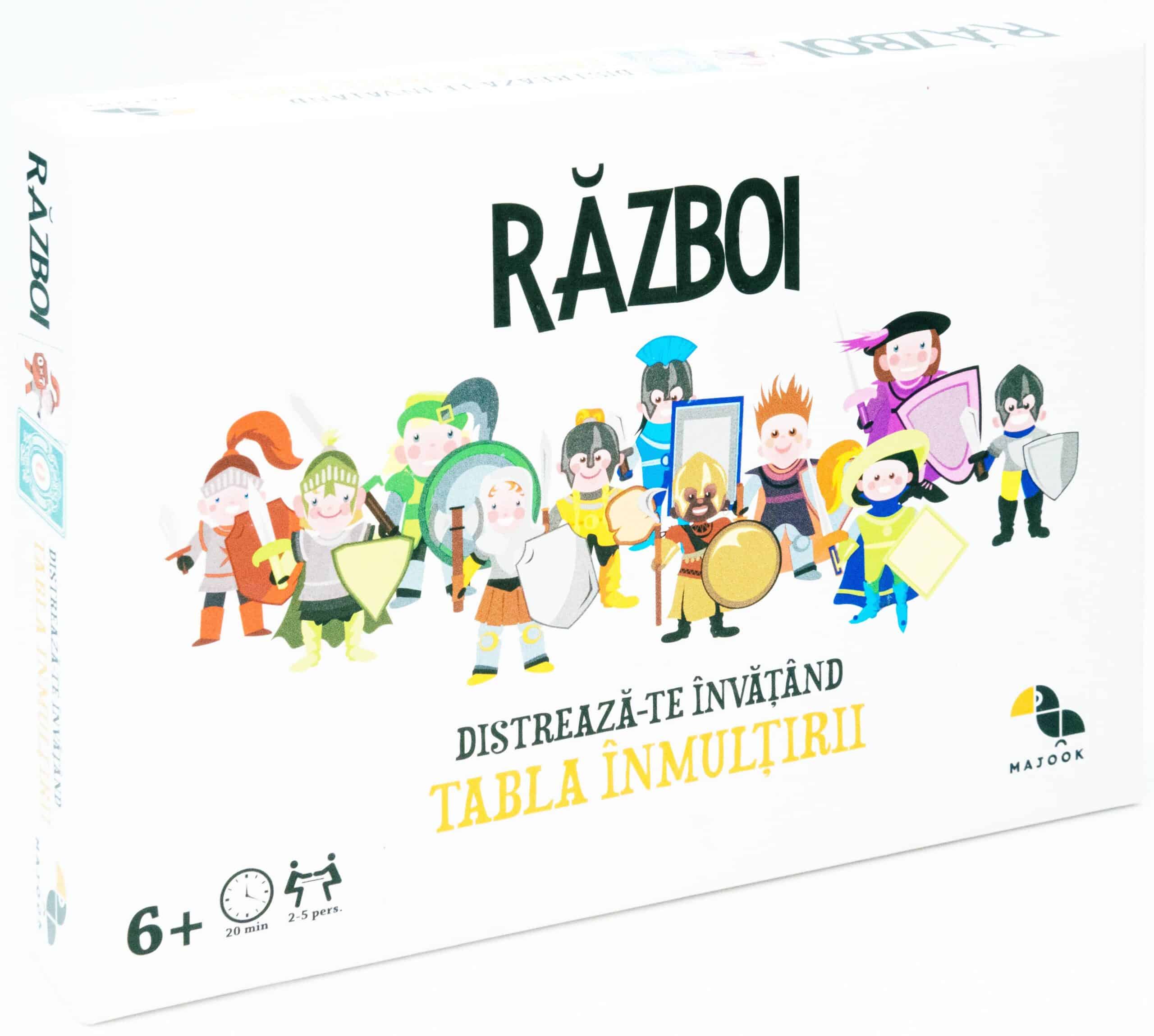 Joc de carti cu Tabla inmultiriiCavaleri neinfricati sunt gata sa se avante in lupta cifrelor cu tabla inmultirii.Scuturile lor poarta operatiile de inmultire, iar rezultatul secret este relevat in oglinda magica. Curajul ii mana inainte pe cavaleri. Sunt gata sa porneasca la Razboi in orice clipa. Dar cine castiga o lupta, nu castiga neaparat si Razboiul. Oare cine va iesi invingator?Razboi este clasicul joc de Razboi, reinterpretat intr-o batalie distractiva a matematicii.Prin acest joc invatarea tablei inmultirii este mai simpla si mai amuzanta ca oricand. Jocul contine:– 120 de cartonase;– instructiuni de joc.Conceptul, grafica si productia produsului sunt realizate exclusiv in Romania.