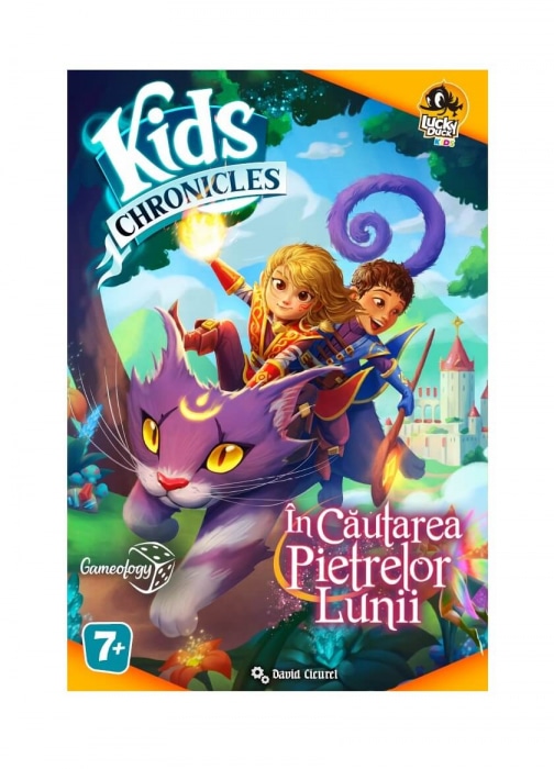 Descopera lumea impresionanta a Kids Chronicles – In Cautarea Pietrelor Lunii (RO), cauta indicii si ia decizii impreuna cu ceilalti jucatori, astfel incat sa ajungeti cei mai mari vrajitori pe care i-a vazut aceasta lume!Kids Chronicles – In Cautarea Pietrelor Lunii (RO) este un joc de aventura si mistere cooperativ pentru 1-4 jucatori cu varsta peste 7 ani. Dedicat intregii familii, imbina jocurile de societate clasice cu tehnologia, sub forma unei aplicatii pentru telefonul mobil cu ajutorul careia se parcurg cele cinci scenarii si se rezolva obiectivele. Aplicatia mobila va fi de asemenea tradusa integral in limba romana.Kids Chronicles – In Cautarea Pietrelor Lunii (RO) este tradus si distribuit in Romania de Gameology.A fost odata ca niciodata doua regate: erau vecine si totusi… nu puteau fi mai diferite. Primul era numit Regatul de Vara atat datorita climei sale calde, cat si a stapanirii sale de catre un rege timid, cu o inima mare. Cel de-al doilea se numea Imperiul de Iarna pentru ca tinutul sau era friguros, acoperit cu zapada si condus de catre o imparateasa autoritara care locuia intr-un palat sculptat in intregime din gheata!Ani de zile a existat un singur vrajitor care servea ambele regate. Cu atatea probleme de rezolvat, vrajitorul a obosit. Iata de ce astazi va cheama la datorie pe voi, noii sai ucenici!Ajutati-l sa rezolve misterele pamantului si experimentati intalniri magice de neuitat. Imbarcati-va intr-o calatorie pentru a descoperi Pietrele Lunii si lucrati impreuna pentru a deveni cei mai mari vrajitori pe care i-a cunoscut vreodata aceasta lume!Componentele jocului:O Tabla de joc cu doua fete (reprezentand Regatul de Vara si Imperiul de Iarna), 21 cartonase cu Personaje, 40 cartonase cu Obiecte, instructiuni de joc in limba romana.Pentru a juca Kids Chronicles – In Cautarea Pietrelor Lunii (RO) nu este nevoie sa cititi instructiunile de joc! Aplicatia pentru telefonul mobil va ghideaza de la inceput si va explica pasii care trebuie parcursi pentru a duce la bun sfarsit scenariile.In acest joc se foloseste tehnologia Scaneaza & Joaca. Fiecare cartonas si componenta fizica are un cod QR unic, care va trebui scanat. Acestea vor debloca diferite evenimente si indicii. Este necesara instalarea aplicatiei gratuite pentru telefonul mobil, Kids Chronicles, din Google Play sau App Store. Odata instalata aplicatia, nu mai este necesara conexiunea la Internet.Obiectivul jocului:Fiecare scenariu ofera o poveste unica de aventura. Jocul este pe deplin cooperativ: jucatorii vor lucra impreuna pentru a rezolva misterul. Povestea se va dezvolta pe masura ce colectati obiecte si vorbiti cu personajele care va ies in cale. Cand reusiti sa rezolvati problemele prezentate la inceputul unei povesti, veti raspunde la cateva intrebari care va vor determina scorul ca echipa.Fiecare poveste finalizata va va oferi una dintre Pietrele Lunii magice. Odata ce le-ati adunat pe toate patru, va veti atinge obiectivul de a deveni magicieni si veti intra in povestea finala a jocului!