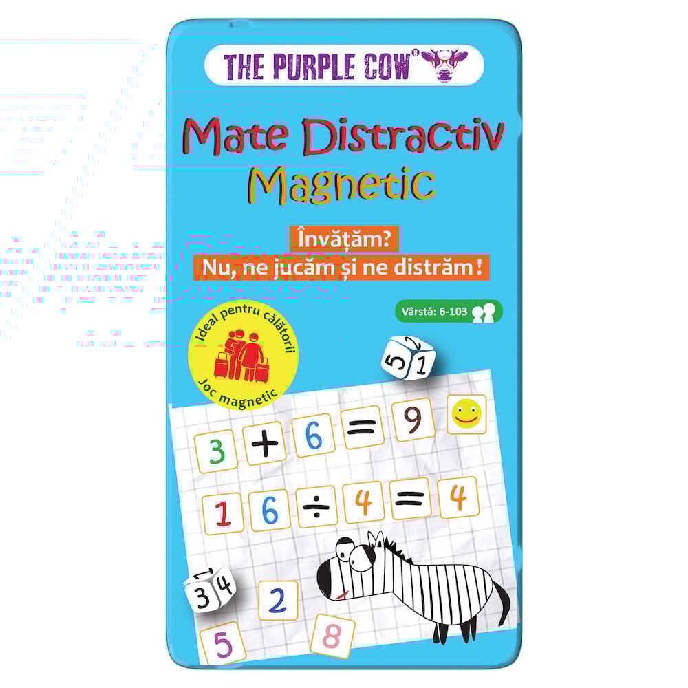Mate Distractiv Magnetic este un joc cu cutie metalica, cu piese magnetice, ideal pentru calatorii( incape in locuri mici). Un joc distractiv, rapid si cu reguli „simple si clare”. Jocul are scopul principal de a invata copii intr-un mod distractiv abilitatile aritmetice de baza folosind semnele si numerele magnetice. Obiectivul acestui joc este sa aduni cele mai multe zambete. Pachetul contine:- 138x numere si simboluri magnetice;- 2x zaruri;- 1x tabla de joc. Dimensiuni produs in ambalaj: 10 x 2 x 18.5 cmGreutate produs: 0.170 kgVarsta recomandata: 6 ani +