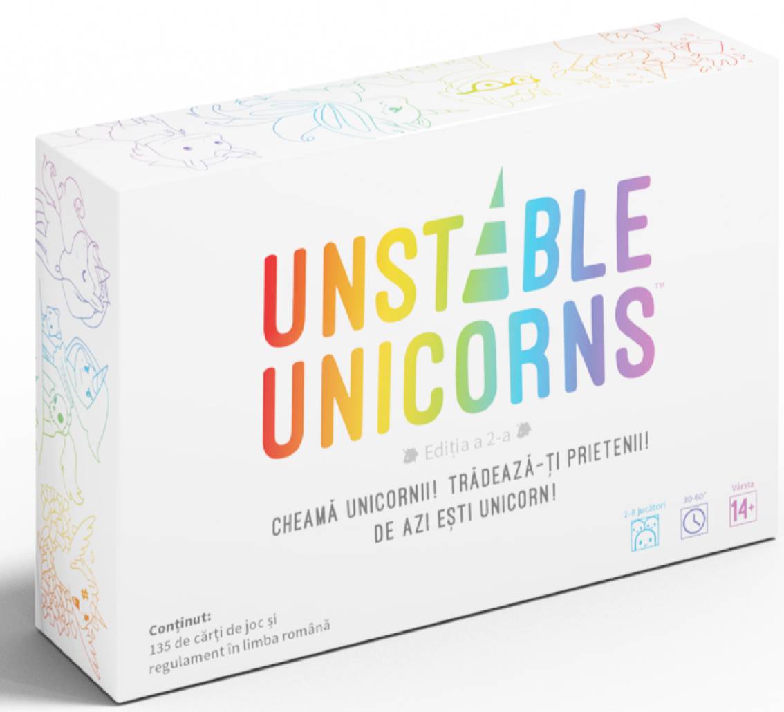 Unstable Unicorns este un joc strategic de carti in care sunt imbinate doua lucruri: Unicorni si Distrugere! Scopul in Unstable Unicorns este sa fii prima persoana care colecteaza 7 Unicorni in zona ta de joc, cunoscuta si sub numele de Grajdul tau.Faceti acest lucru adunandu-va propria armata de Unicorni si folosind o combinatie a puterilor lor magice si a cartilor Magice, Instant, Upgrade si Downgrade pentru a impiedica progresul celorlalti jucatori si pentru a le distruge Unicornii.Dar atentie – fiecare jucator are la dispozitie toate aceste instrumente si s-ar putea sa-ti gasesti doar planurile frustrate de o carte „Neigh!” bine jucata. AVERTISMENT: Contraindicat copiilor sub 3 ani. Produsul contine elemente mici, pericol de sufocare! Se recomanda supravegherea copilului de catre un adult in timpul jocului.