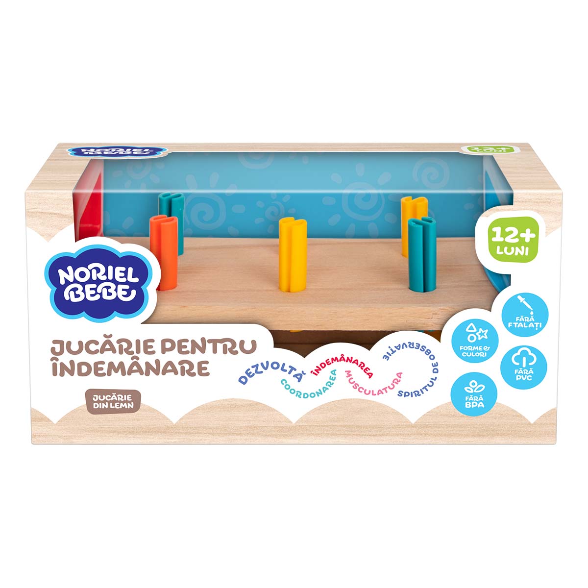 Invata despre cum actiunile tale provoaca reactii in elementele din jur! Foloseste ciocanelul ca sa impingi pinii colorati prin spatiile lor, apoi intoarce platforma de joc si loveste-i din nou ca sa ii aduci la loc. Dimensiuni produs in ambalaj: 22,5 x 13,5 x 11,5 cm Varsta recomandata: 6 luni +