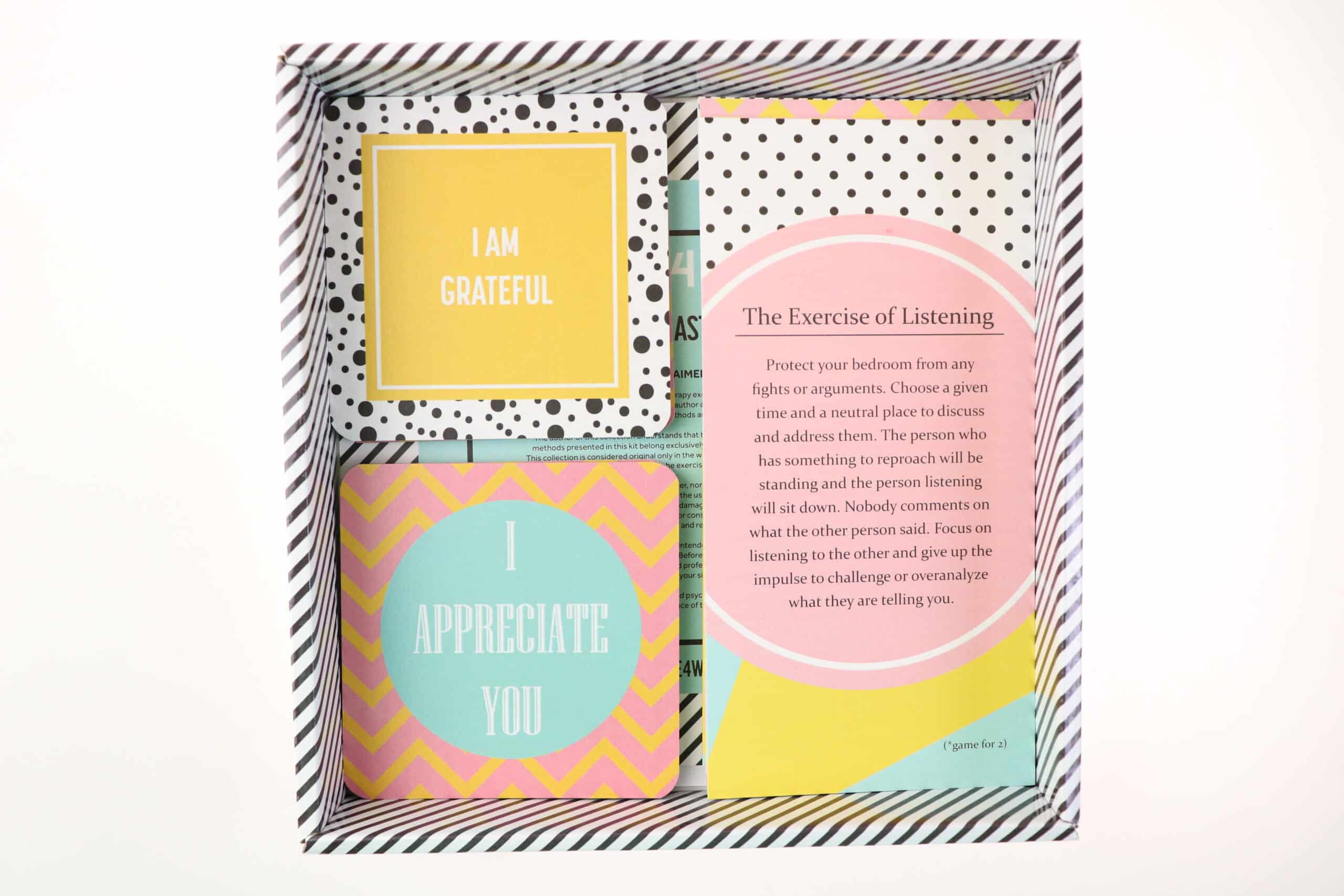 Kit de exercitii NLP pentru optimizarea relatiilor de cuplu in limba engleza elaborat de Alina Ionescu.Continut: 15 cartoane cu exercitii psihologice & 6 mementouri de iubire.Ori de cate ori simtiti un moment tensionat in relatia voastra, puteti face urmatoarele:( A ) aliniati cardurile, citindu-le pe toate, una cate unasau( B ) trageti un card aleatoriu, avand incredere ca va veni cea mai potrivita sugestie pentru starea dumneavoastra actuala.