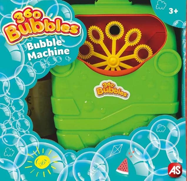 Aparat pentru bule de sapun 360 bule. Faceti mii de bule in cateva secunde!Doar adaugati lichidul in masina cu bule de sapun, apasati butonul si urmariti cum ies nenumarate bule!In interiorul produsului se afla o sticla de lichid de 118 ml pentru bule de sapun.Functioneaza cu 3 baterii AA (nu sunt incluse).