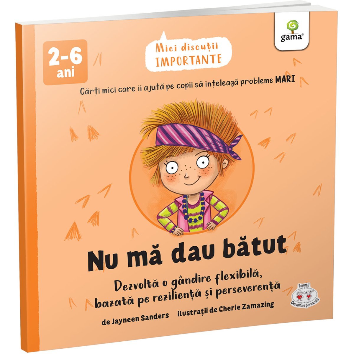 Aceasta carte ii va ajuta pe copii sa inteleaga si sa-si dezvolte rezilienta si perseverenta. Dezvoltarea unei gandiri flexibile de la o varsta frageda ii va ajuta sa faca fata provocarilor vietii de zi cu zi! Gandirea flexibila ajuta copiii sa dezvolte o atitudine pozitiva, spunandu-si „Pot s-o fac” si „Nu ma dau batut” cand lucrurile devin dificile sau nu merg conform planului.Colectia „Mici discutii importante” a fost creata pentru a-i ajuta pe parinti, pe educatori si pe alte persoane care au copii in grija sa poarte discutii deschise si incurajatoare cu copiii. Sugestiile de intrebari de la finalul cartilor sunt de un real folos pentru adaptarea celor mai importante, dar dificile subiecte la limbajul si varsta copiilor. Cartile sunt recomandate pentru copii intre 2 si 6 ani. Numar pagini: 24Dimensiuni: 15 x 15Tip coperta: necartonataAn aparitie: 2022Autor: Jayneen Sanders