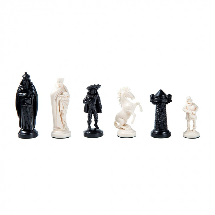 Piese sah tematice din plastic cu designul inspirat din perioada Evului Mediu. Culoarea pieselor: alb – negru Greutate : 384 g Inaltime rege : 9,68 cm Diametru rege : 2,99 cm Inaltime pion : 5,97 cm Diametru pion : 2,33 cm