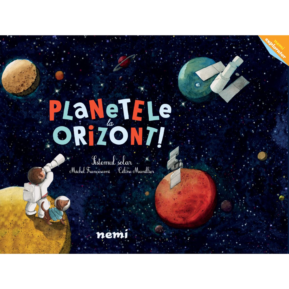 Noaptea cerul are propria viata. Viata sa e formata din planete galaxii si sateliti… Un intreg univers gata sa fie explorat! Planetele la orizont! Haideti sa ne apropiem de Mercur si de caldura sa infernala. Sau o putem admira pe Venus cea luminoasa. Sau pe Marte cu solul lui rosu incredibil. Vom descoperi aici miscarile gratioase ciclice ale planetelor in jurul stelei noastre Soarele; Calea Lactee cea stralucitoare; satelitii naturali si ciudatele statii orbitale – opera oamenilor. Numar pagini: 32Dimensiuni: 27.5 x 20.5 cmTip coperta: CartonataAn aparitie: 2020Autor: Celine Manillier, Michel Francesconi