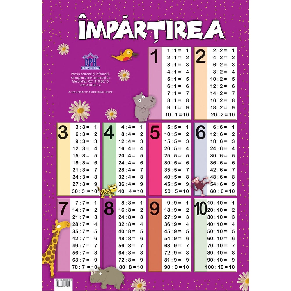 Plansa educativa viu colorata – Tabla impartirii Numar pagini: 1Dimensiuni: 50 x 70 cmTip coperta: Cartonata plastifiataAn aparitie: 2015