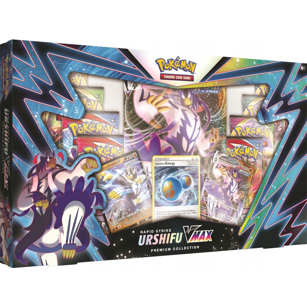 Urshifu Rapid Strike VMAX Premium Box include: – 1 carte promo foil cu Rapid Strike Urshifu V – 1 carte promo etched cu Rapid Strike Urshifu VMAX – 1 carte speciala foil Rapid Strike Energy – 1 carte oversize cu Rapid Strike Urshifu VMAX – 8 pachete boos