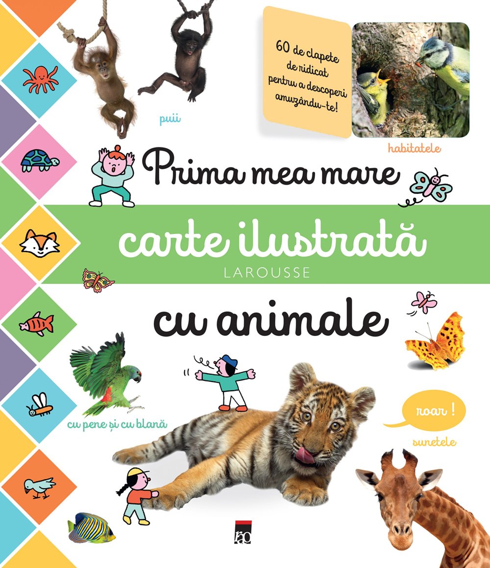 Aceasta carte interactiva cu imagini a fost conceputa pentru a-i ajuta pe cei mici sa descopere lumea animalelor: puii, femelele si masculii, habitatele, sunetele,urmele, modul de deplasare… Cu ajutorul intrebarilor si al unor numeroase clapete ce pot fi ridicate, ea le propune micilor cititori o descoperire activa prin intermediul jocului. 250 de cuvinte, 200 de imagini si de desene amuzante ii vor ajuta sa observe, sa inteleaga si sa-si imbogateasca vocabularul. Recomandata pentru grupa de varsta 2 – 5 ani. Numar pagini: 20Dimensiuni: 13 x 20.5 cmTip carte: CartonataAn aparitie: 2020Autor: Larousse