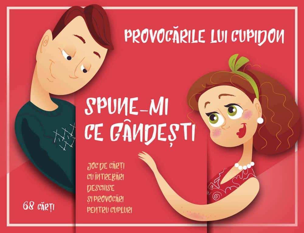 Joc de carti cu intrebari deschise si provocari pentru cupluriVrei sa fii mai fericit(a) in relatia ta de dragoste?Jocul „Provocarile lui Cupidon” te poate ajuta sa iti construiesti relatia de dragoste mult visata.Raspunzand la intrebarile si provocarile jocului te vei descoperi mai bine pe tine si pe partenerul tau.Ce contine jocul ”Provocarile lui Cupidon?46 de carti cu intrebari22 de carti cu provocari*cartile cu intrebari contin Tips-uri ajutatoare extrase din carti de dezvoltare personala sau studii si cercetari stiintifice.