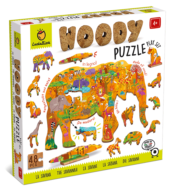 Woody Puzzle Play Set contine 48 de piese din lemn de mesteacan, cu dimensiunile 25 x 35 cm, care se folosesc pentru a obtine forma a 12 animale diferite cu baze din lemn.