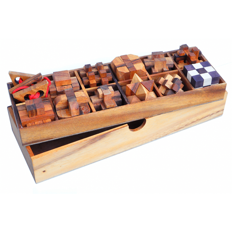 12 puzzleuri de lemn intr-un pachet.Dificultate:4x extrem de grele, 4x medium, 4x foarte grele. Dimensiune: 5x5x5 cm/puzzle Dimensiunea cutiei: 36.6 x 13 x 8 cm