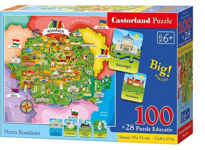 Cu ajutorul puzzle-ului educativ de la Castorland, copiii vor invata cu placere detalii despre tara lor. Datorita minitestului de asociere (format din 100+ 28 de piese) ei vor asocia locatii celebre cu orasa ca Palatul Culturii din Iasi sau Casinoul din Constranta.Puzzle-ul este premium, cartonul este gros si perfect taiat.Varsta: 6+