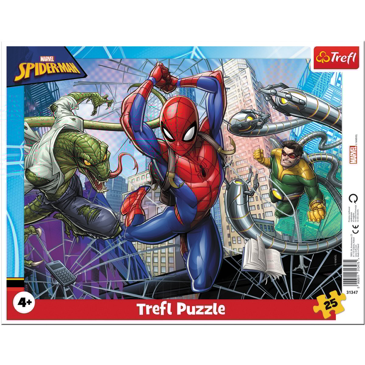 Puzzle format din 25 piese, conceput pentru toti fanii Spiderman. Pentru fabricarea puzzle-urilor cu rama dedicate copiilor mai mici, s-au folosit materiale ecologice si hartie de panza care elimina reflexia luminii, ceea ce garanteaza siguranta si distractia. Dimensiuni puzzle: 31.5 x 23.7 cmDimensiuni articol ambalat: 37 x 0.3 x 28.8 cmGreutate articol: 216 gVarsta recomandata: 4 ani +