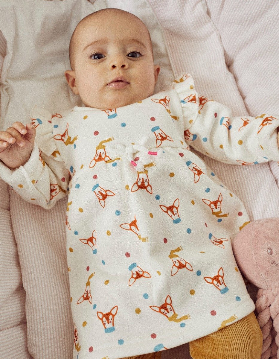 Rochie pentru fetite nou-nascute, cu model imprimat, talie cu volanase si fundita decorativa. Are nasturi la spate pentru o imbracare usoara. Compozitie material: 70% Bumbac, 27% Poliester, 3% Elastan