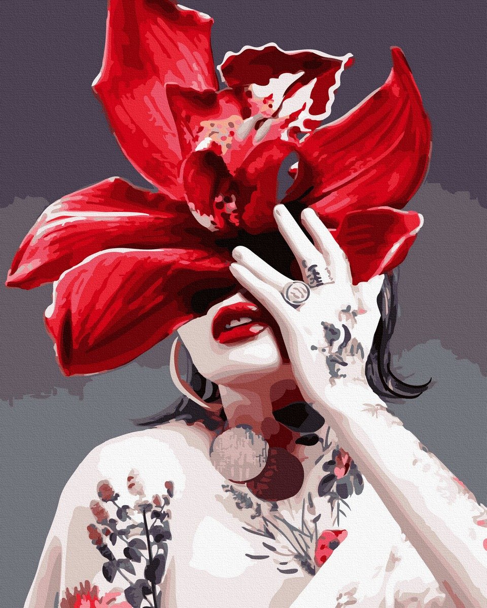 Set Acuarello, Pictura pe numere, Abstract, Portret floare rosie, cu rama din lemn, pensule si culori acrilice