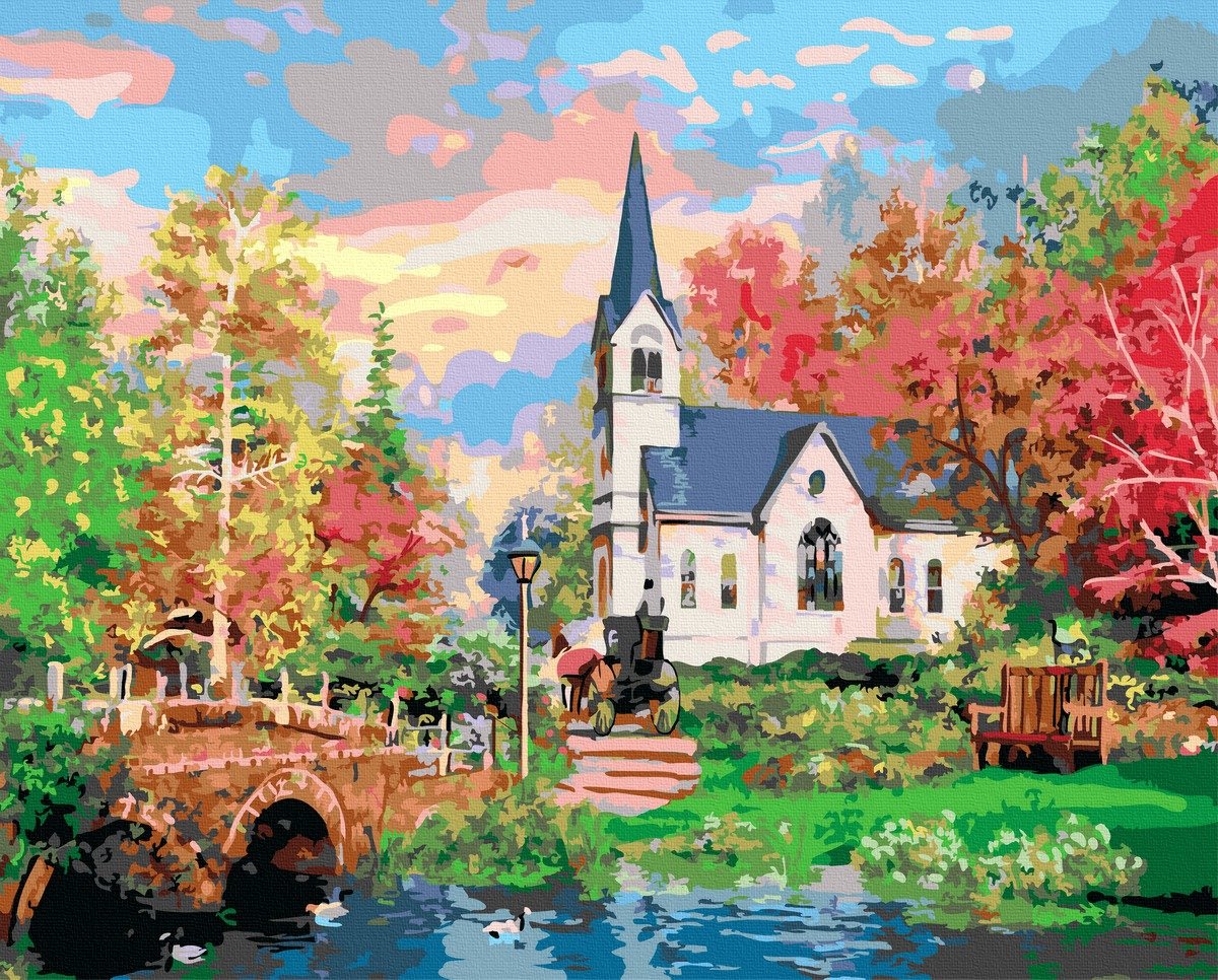 Set Acuarello, Pictura pe numere, Casuta de pe deal, cu rama din lemn, pensule si culori acrilice