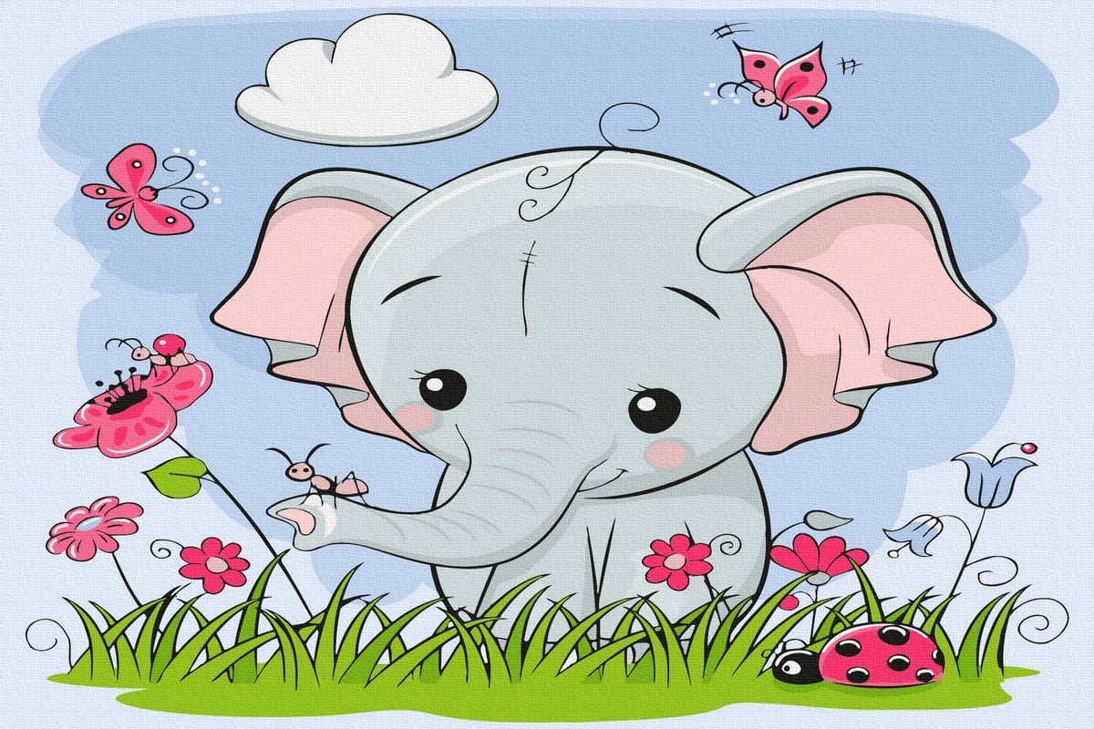 Set Acuarello, Pictura pe numere, Elefantul cu floricele, cu rama din lemn, pensule si culori acrilice