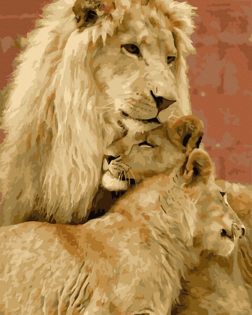 Set Acuarello, Pictura pe numere, Familie de lei, cu rama din lemn, pensule si culori acrilice